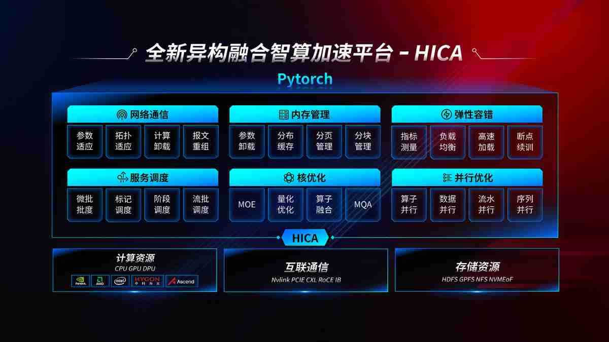 通过自研的服务层、、、中间适配层、、以及调度编排算法,,,,采用数据并行、、模型并行等多种并行方式,,,,把并行计算任务进行有效的分解,,使其分别由相应的软件栈和算力资源来承接。。。当GPU资源变化,,HICA可以实时动态调度计算子任务并调整模型拓扑和架构,,,,以充分聚合各种算力资源。。