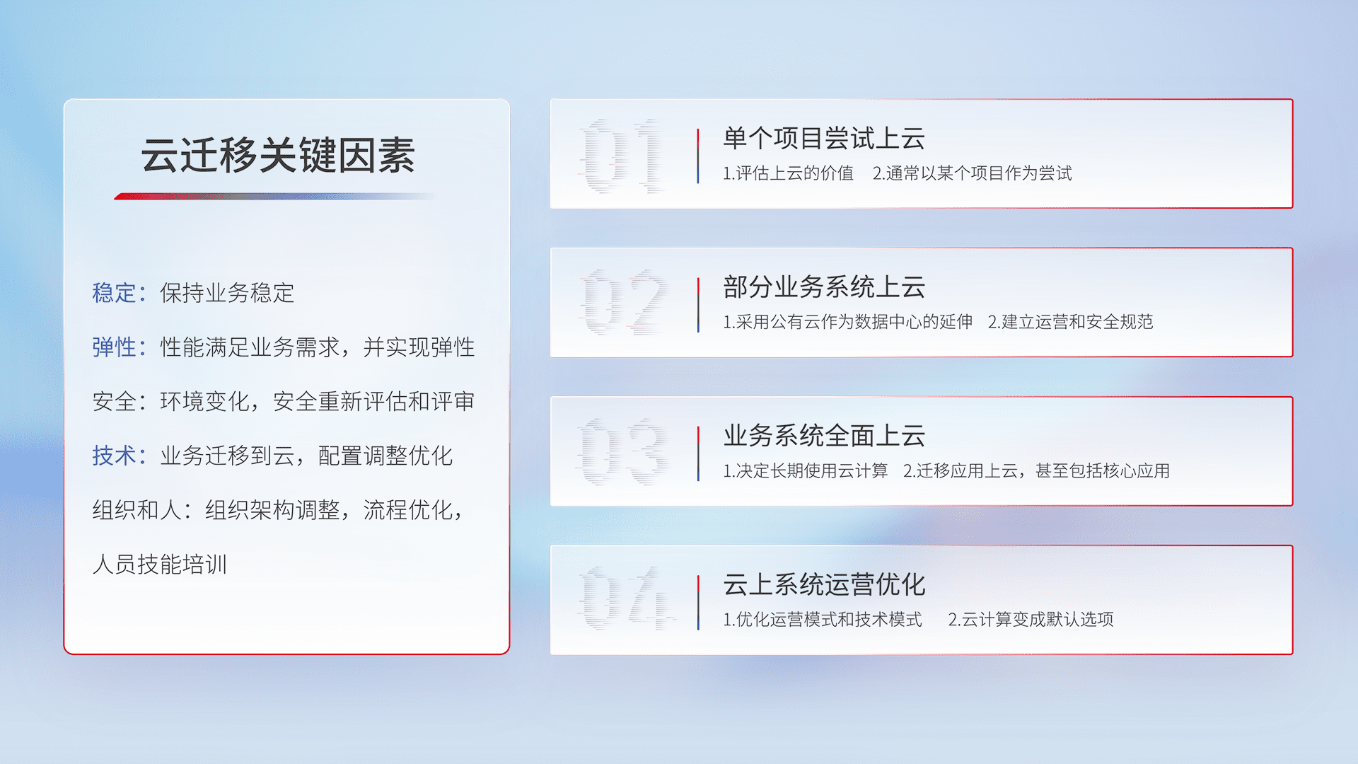 结合实际业务,,从规划设计、、、云平台选型、、云原生改造、、、、数据迁移、、、、集成交付,,,,迁移全过程为客户识别最佳上云路径,,,做好风险识别管理,,,,设计网络架构、、、身份权限、、安全审计合规、、操作审计、、日志审计、、监控告警策略、、多站点容灾设计等,,,对云上基础设施进行整体规划,,提升IT治理水平,,,,以满足弹性、、高可用、、高性能的需求。。。