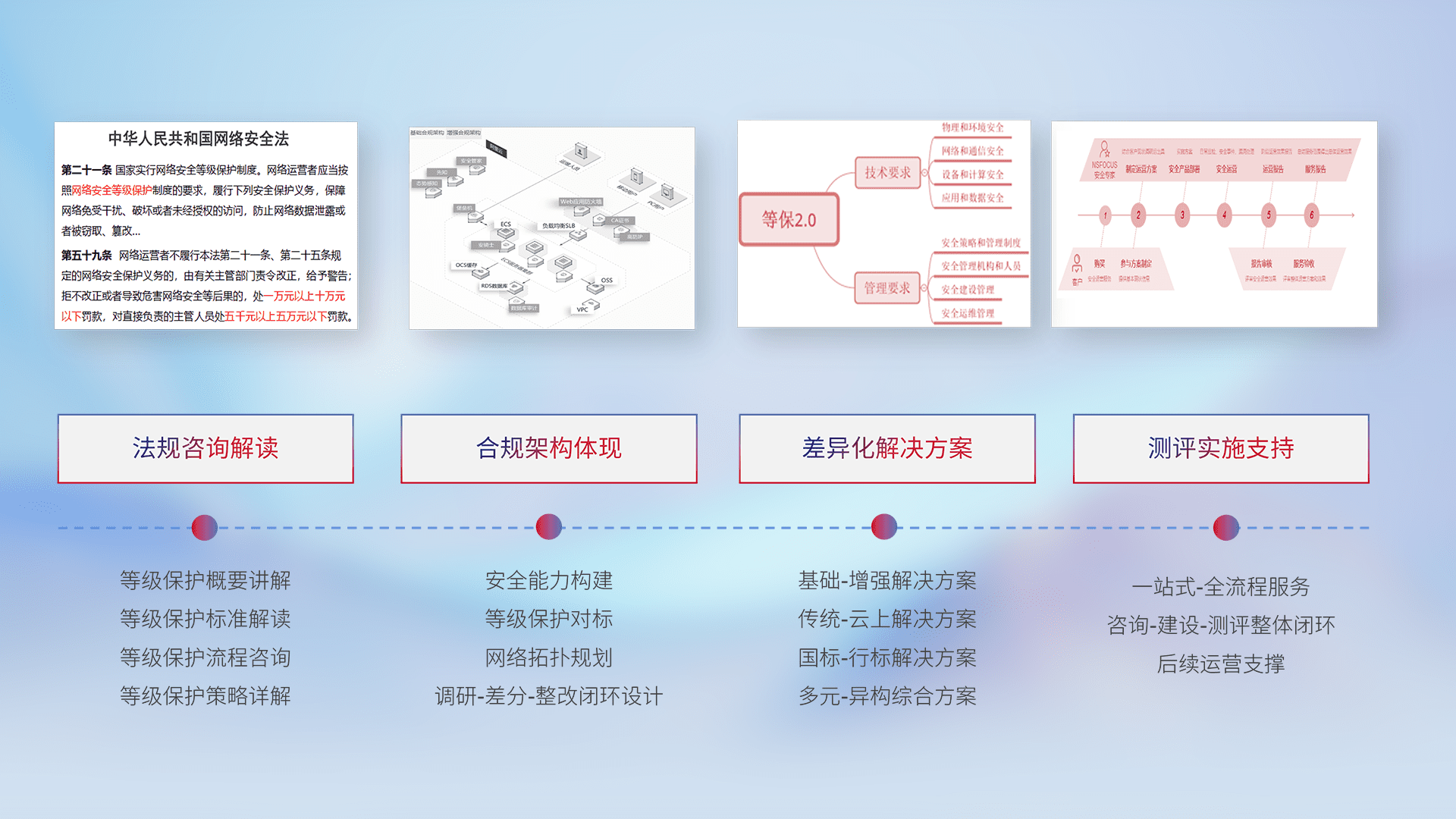 通过专业的法律咨询解读、、合规架构体现、、差异化解决方案、、、、测试实施支持等服务,,,为客户量身打造等保合规体系。。